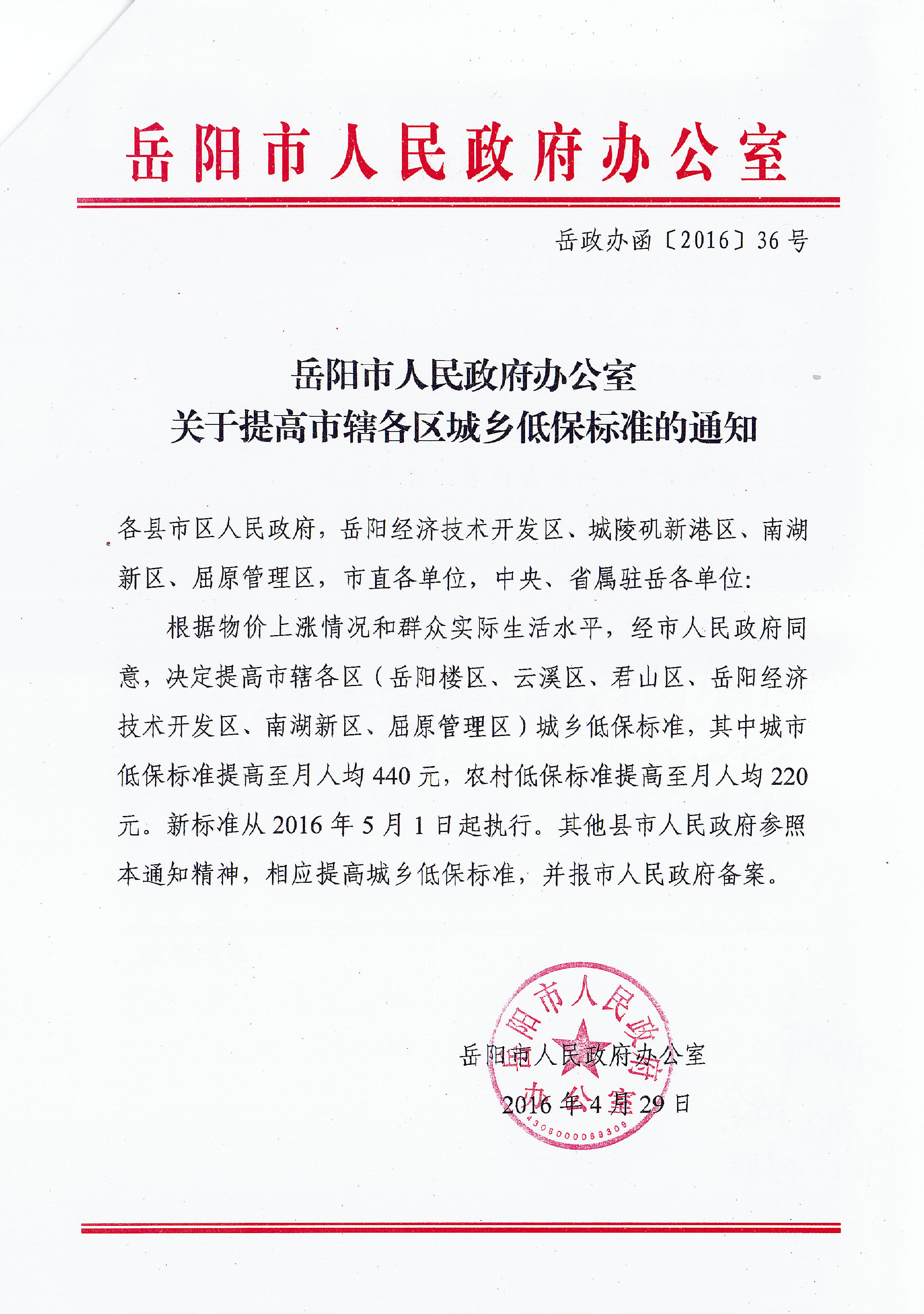 关于提高市辖各区城乡低保标准的通知