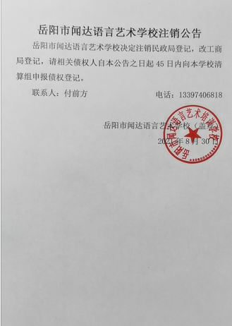 岳阳市闻达语言艺术学校注销公告