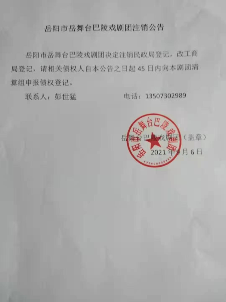 岳阳市岳舞台巴陵戏剧团注销公告