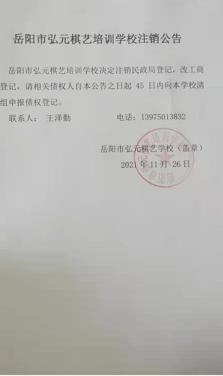 岳阳市弘元棋艺培训学校注销公告