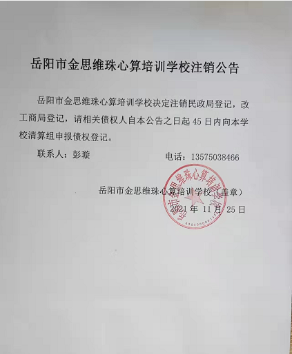 岳阳市金思维珠心算培训学校注销公告