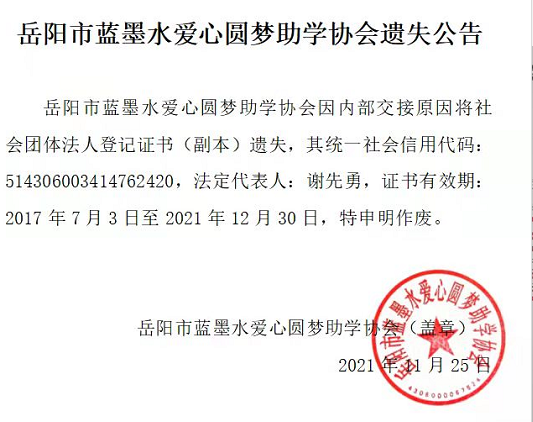 岳阳市蓝墨水爱心圆梦助学协会遗失公告