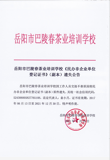 岳阳市巴陵春茶叶培训学校《民办非企业单位登记证书》(副本)遗失公告