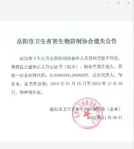 岳阳市卫生有害生物防值协会遗失公告