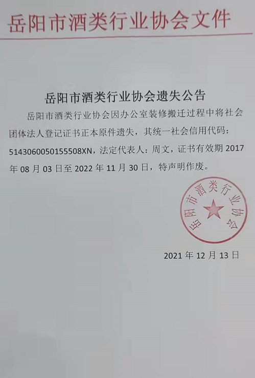 岳阳市酒类行业协会遗失公告
