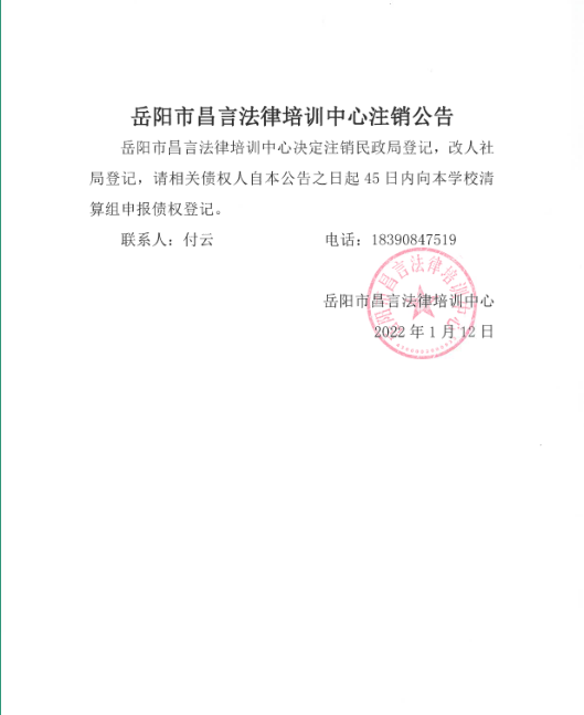 岳阳市昌言法律培训中心注销公告