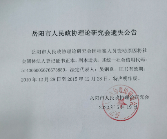 岳阳市人民政协理论研究会遗失公告