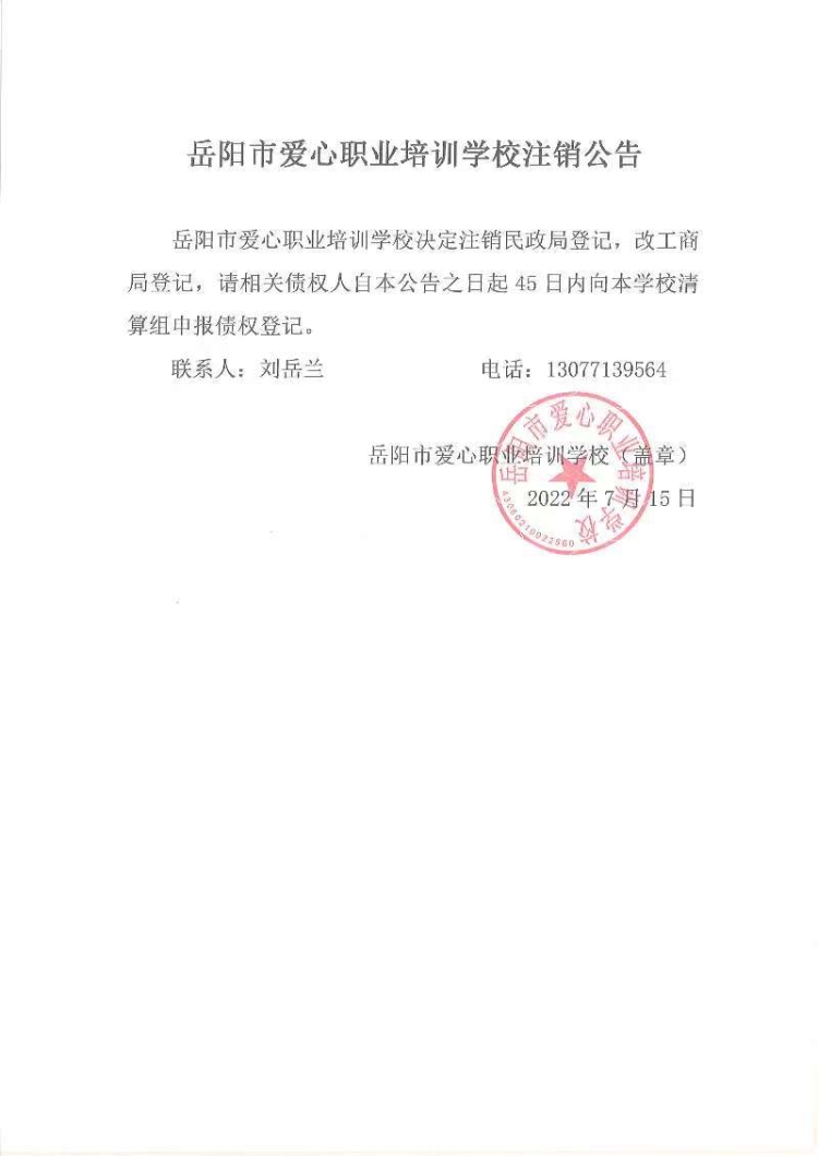 岳阳市爱心职业培训学校注销公告