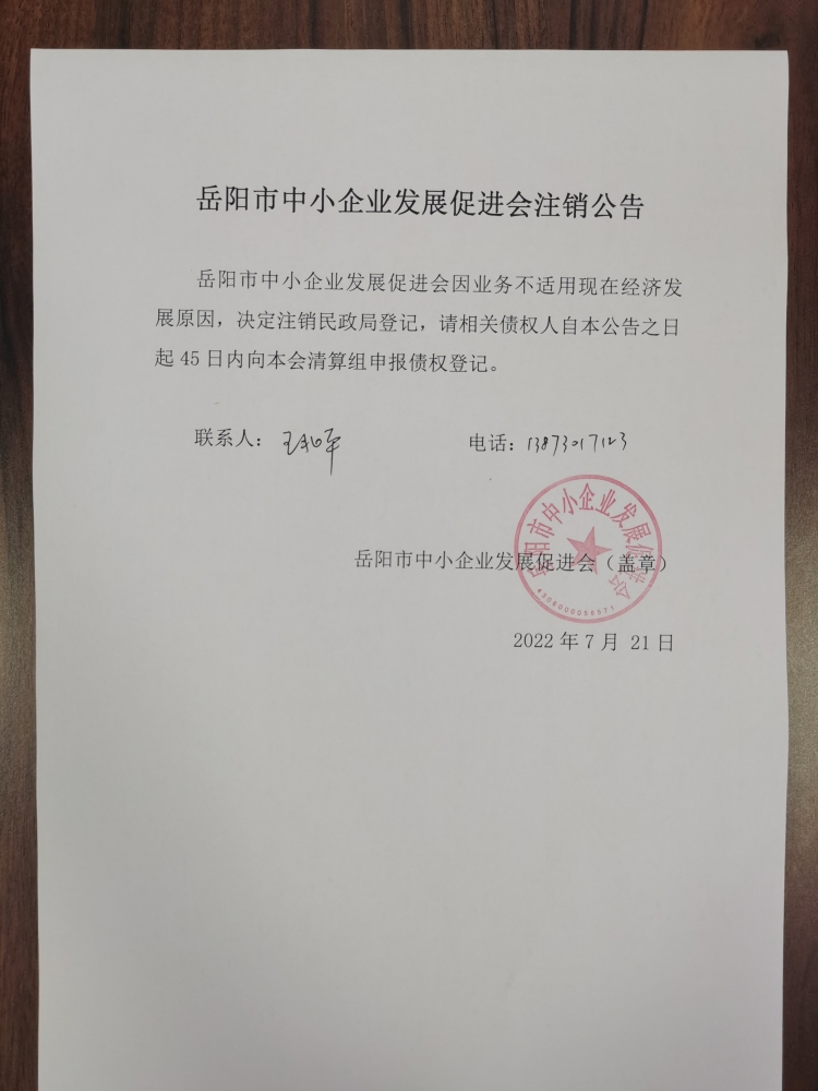 岳阳市中小企业发展促进会注销公告