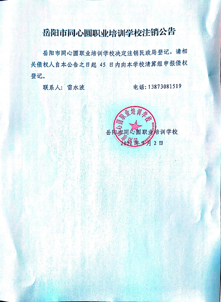 岳阳市同心圆职业培训学校注销公告