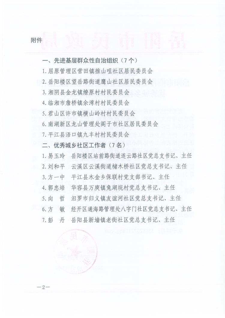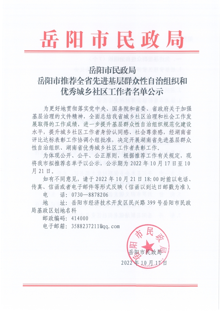 岳阳市推荐全省先进基层群众性自治组织和优秀城乡社区工作者名单公示