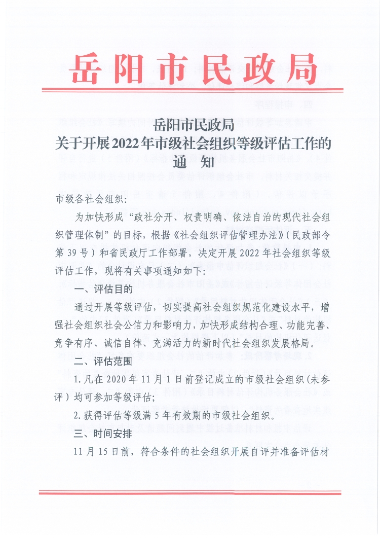 关于开展2022年市级社会组织等级评估工作的通知