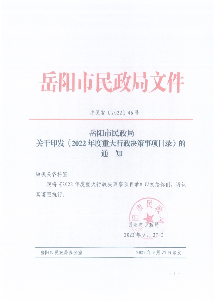 岳阳市民政局关于印发《2022年度重大行政决策事项目录》的通知