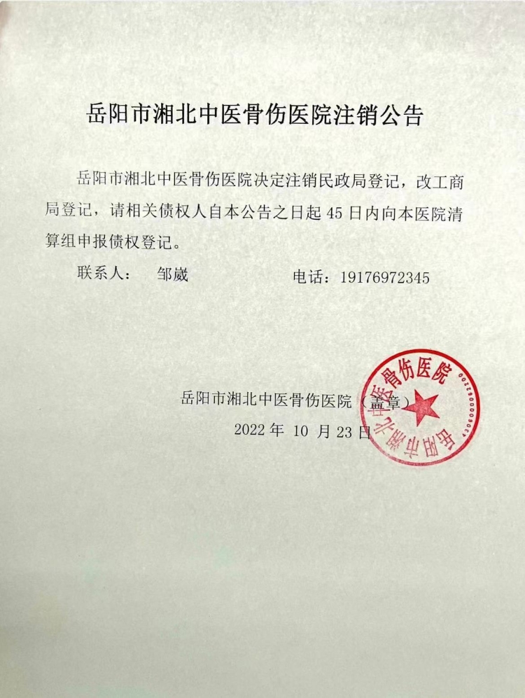 岳阳市湘北中医骨伤医院注销公告