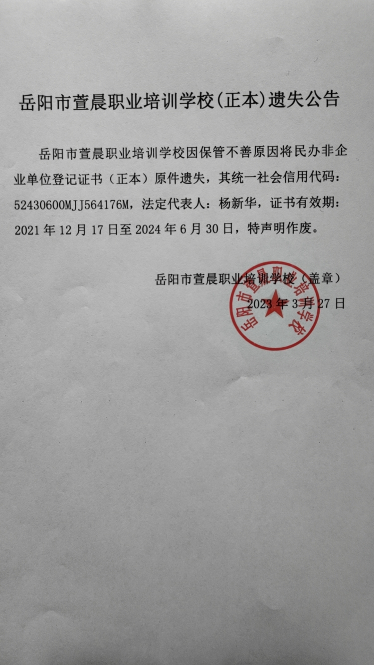 岳阳市萱晨职业培训学校(正本)遗失公告