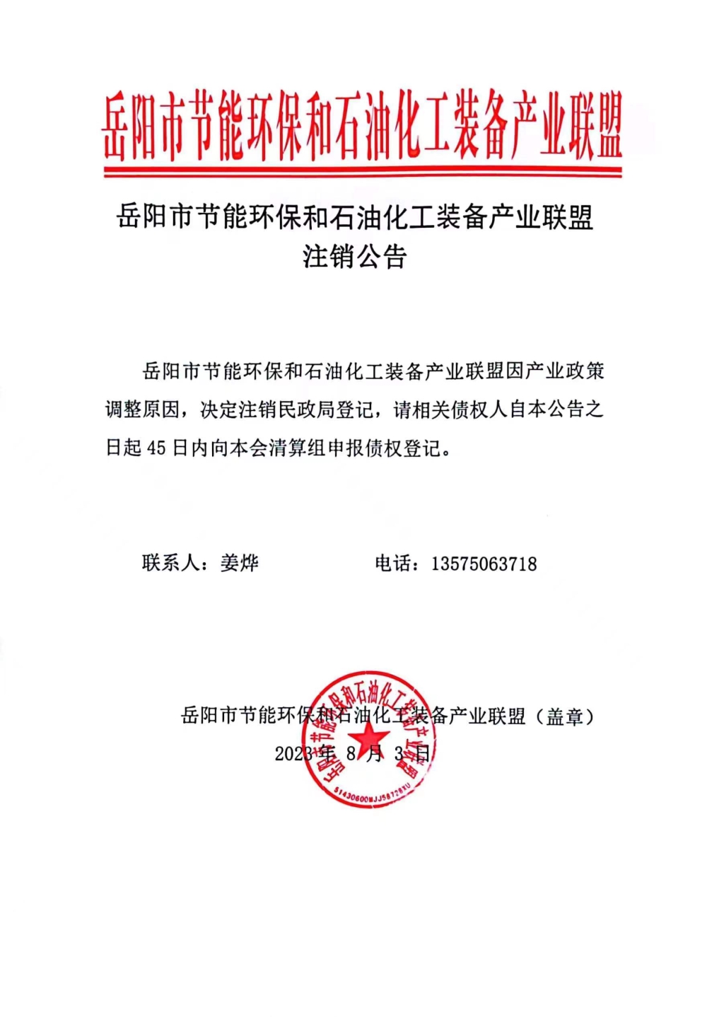 岳阳市节能环保和石油化工装备产业联盟注销公告