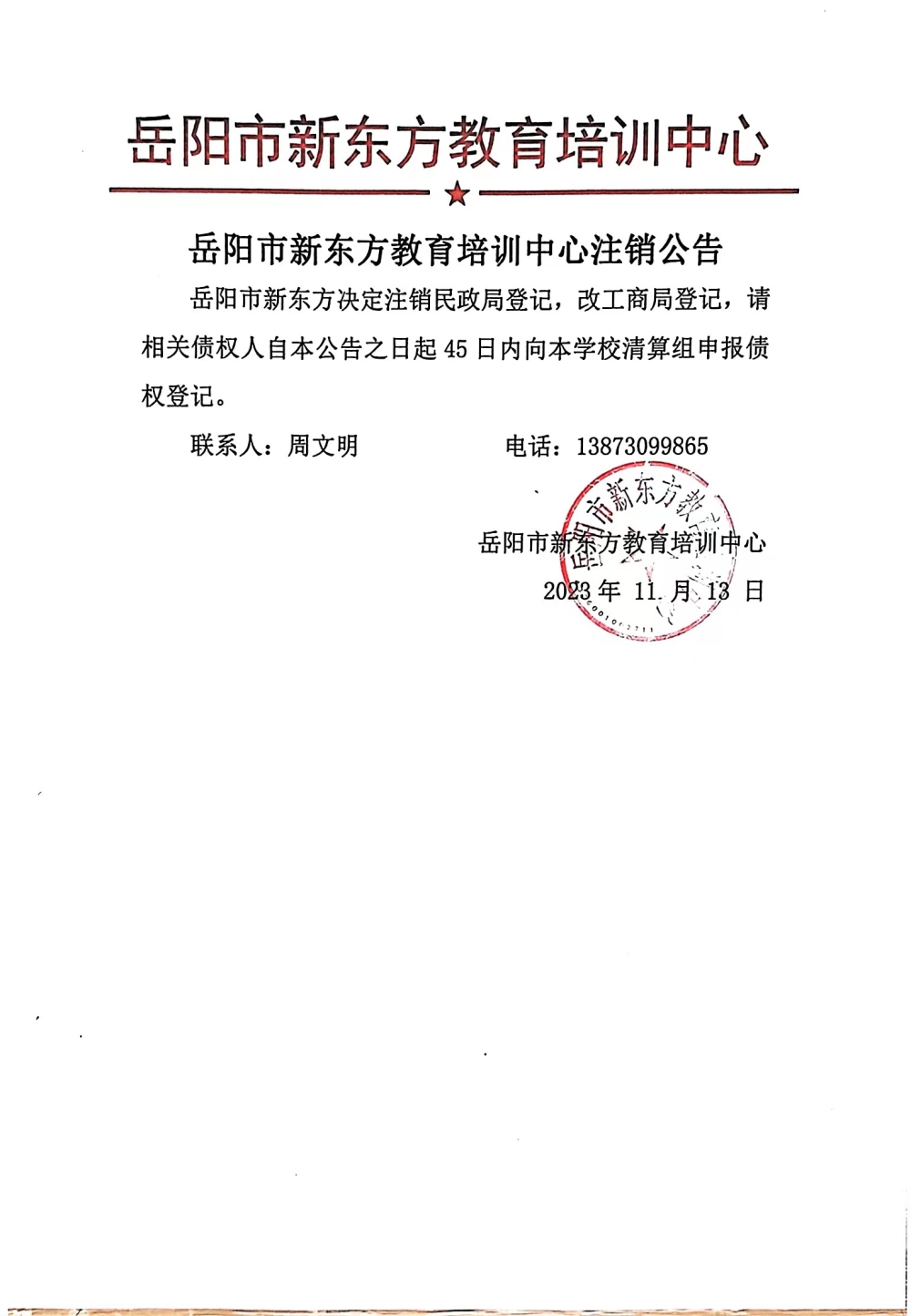 岳阳市新东方教育培训中心注销公告