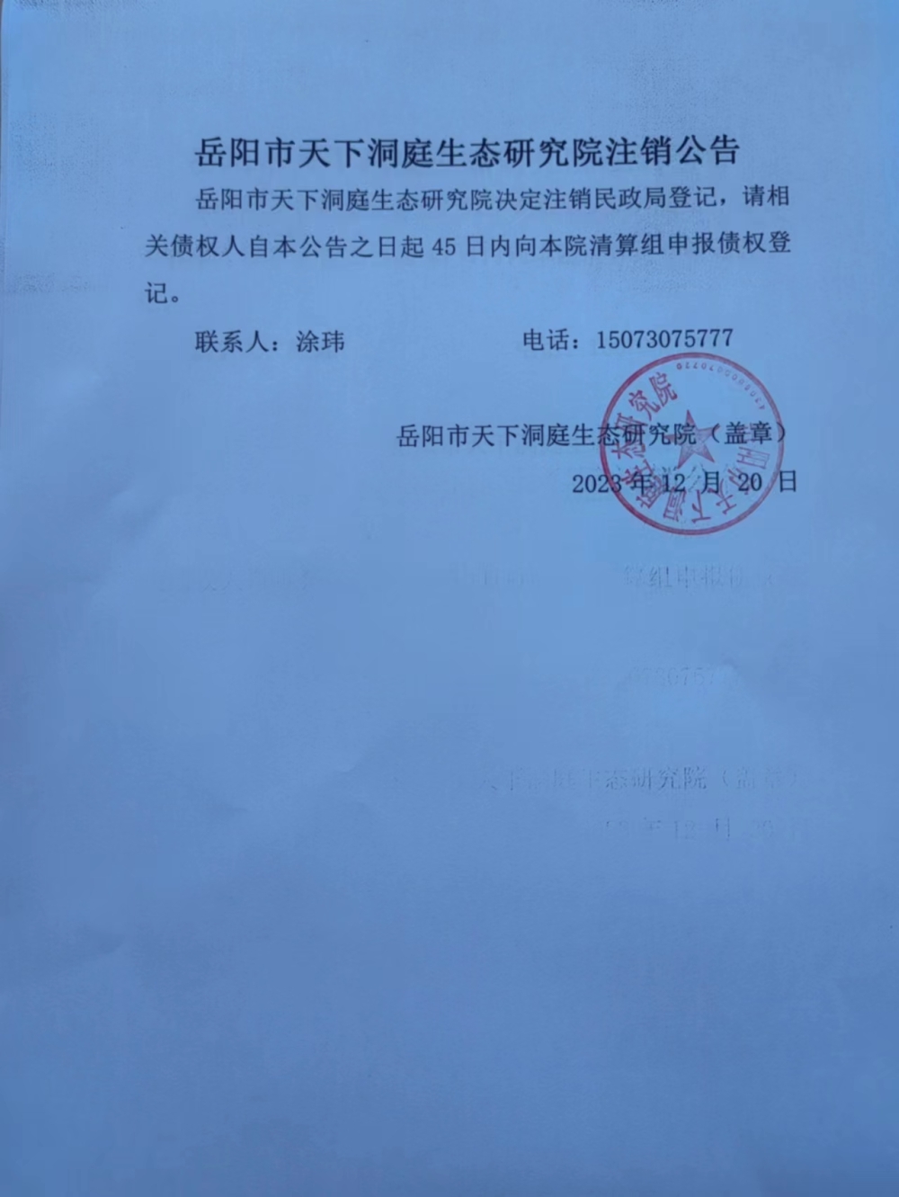 岳阳市天下洞庭生态研究院注销公告