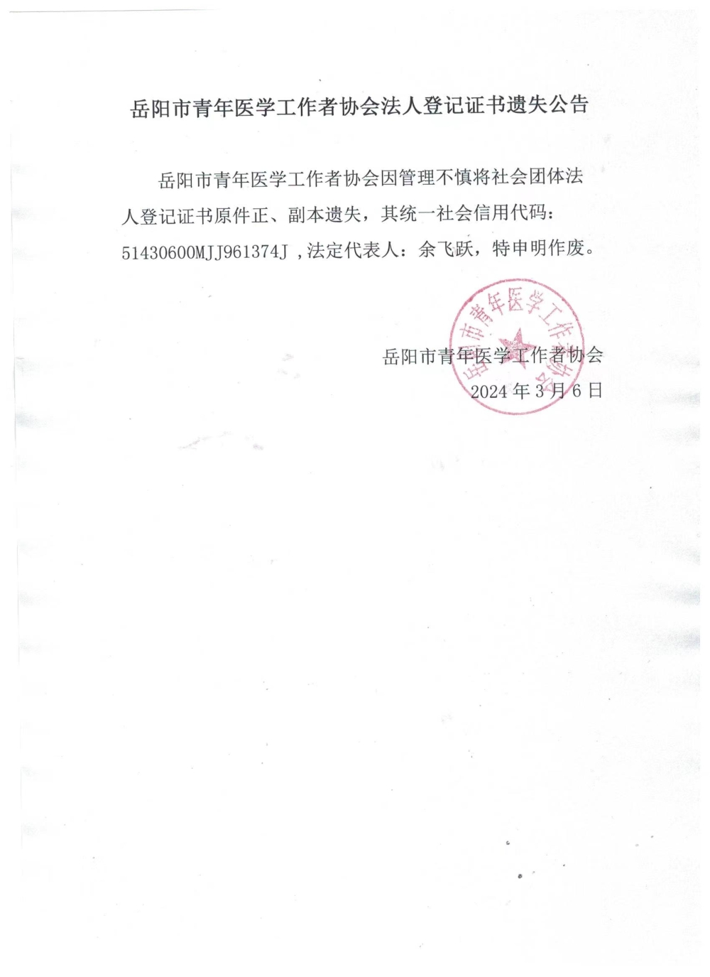 岳阳市青年医学工作者协会法人登记证书遗失公告