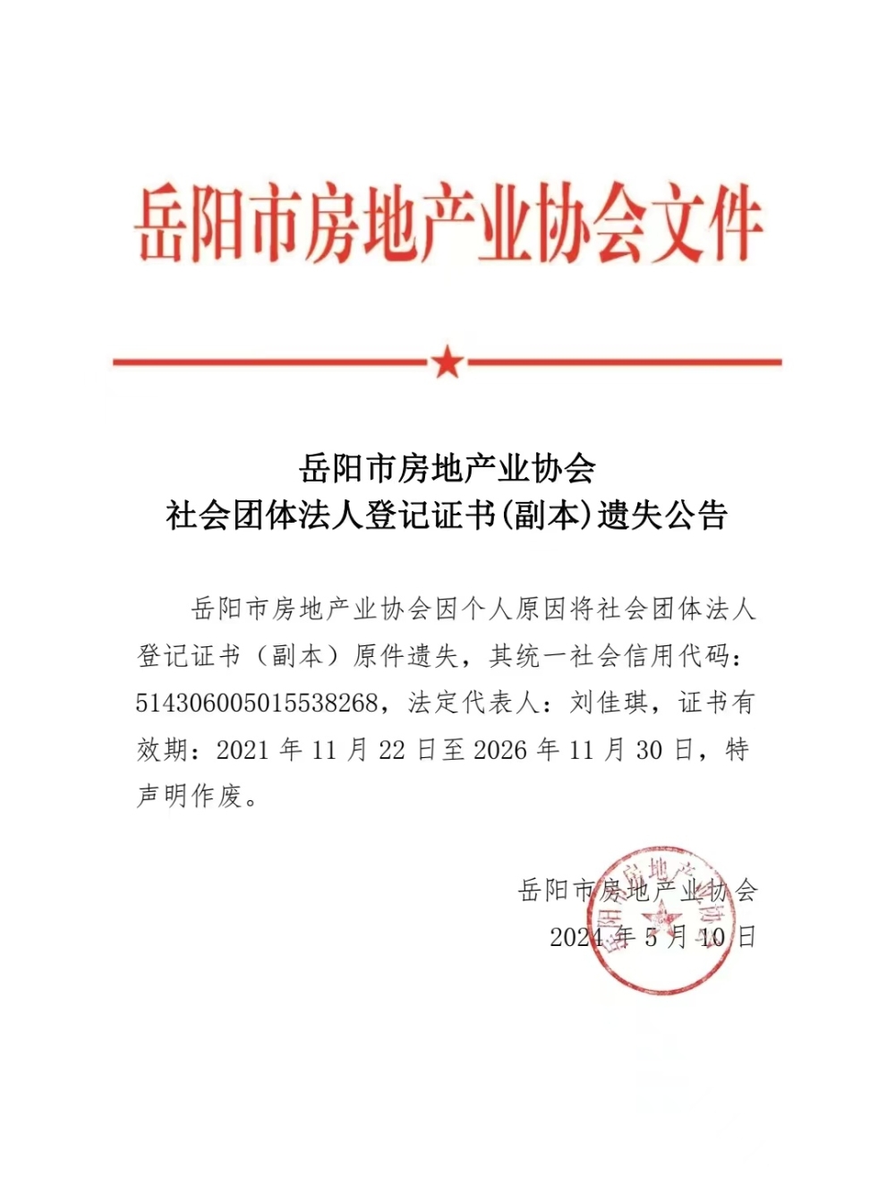 岳阳市房地产业协会社会团体法人登记证书(副本)遗失公告