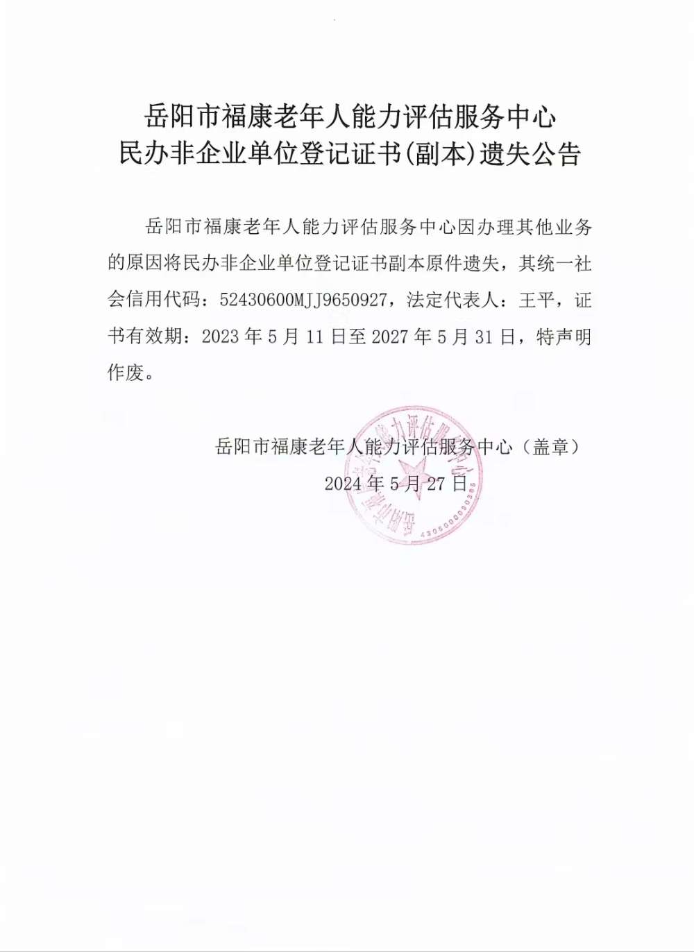 岳阳市福康老年人能力评估服务中心民办非企业单位登记证书(副本)遗失公告