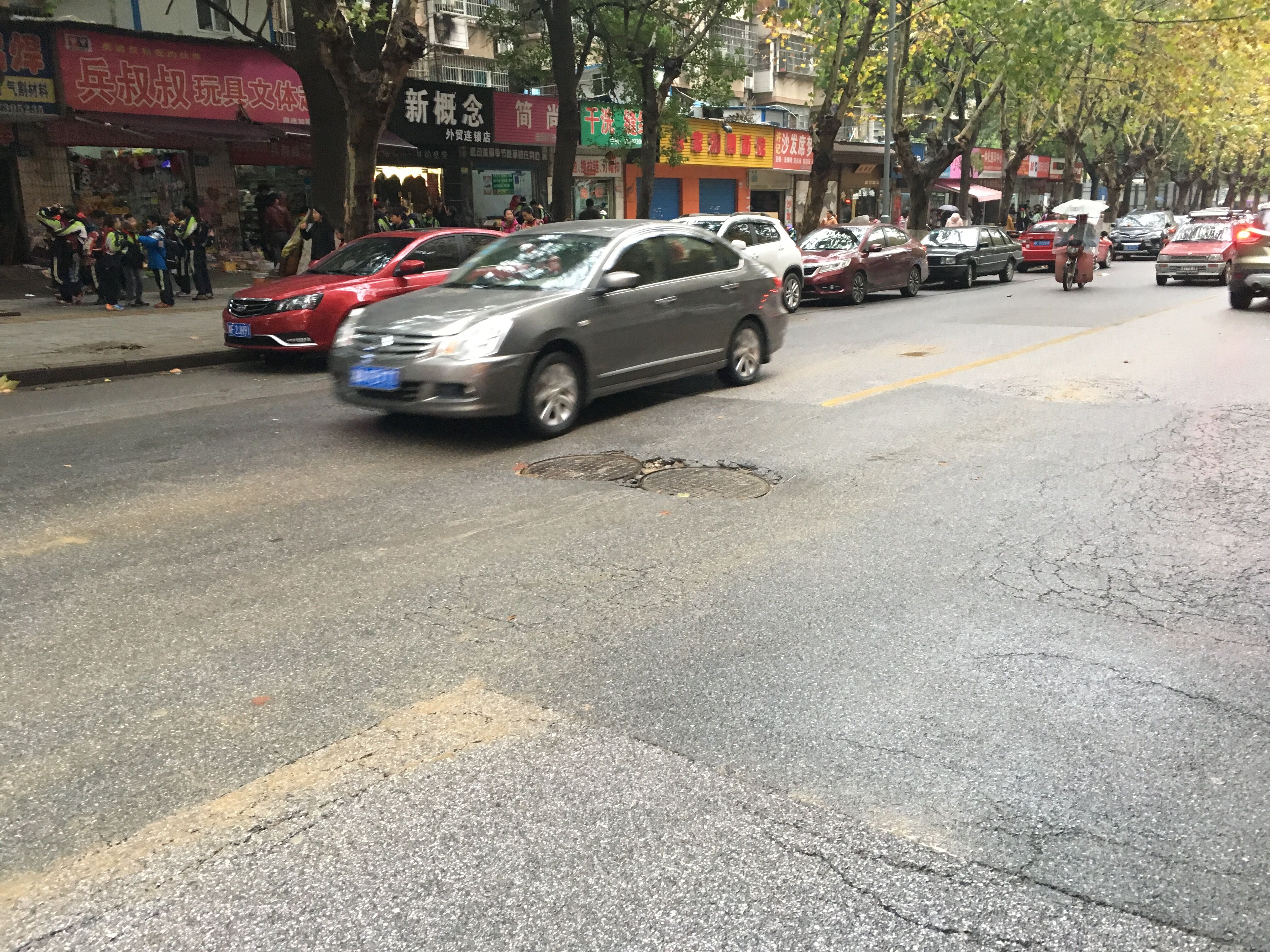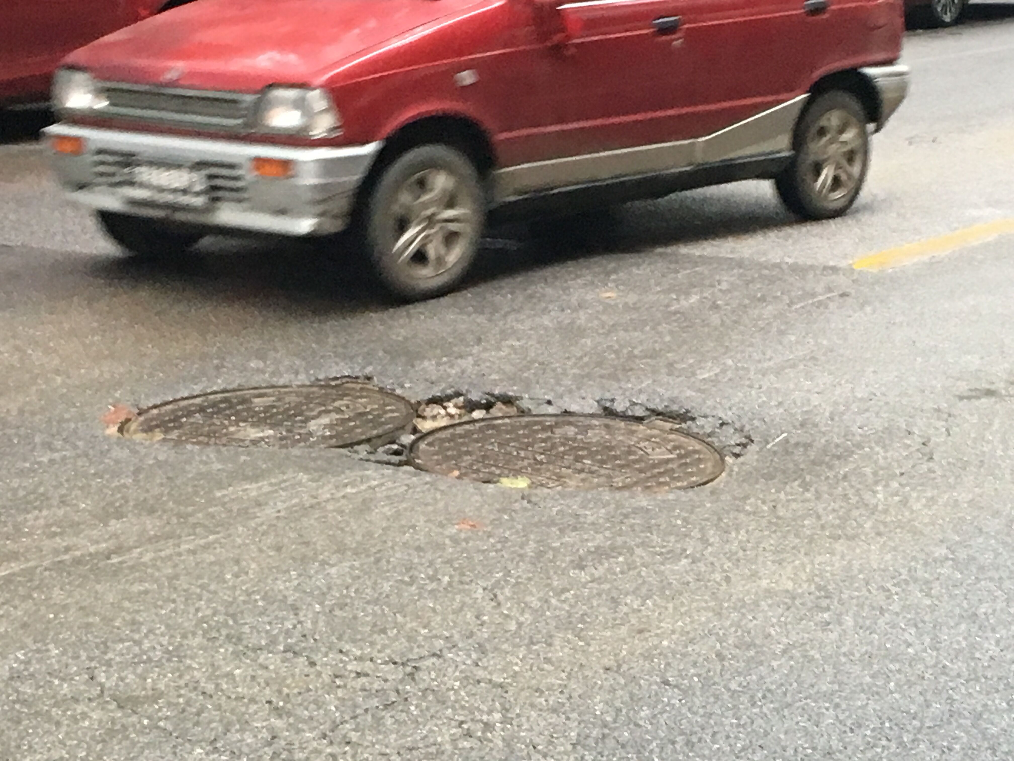 花板桥金域华府门前的马路上,有两个下水道井盖,由于处理不好井盖和路面的关系,导致此路段路面形成了两个较大的坑,路过此处的车辆都需要绕行,如果摩托车、电动车经过此处没有注意还容易发生交通事故。中国作为一个工业强国,难道就被这两个下水道井盖难住了吗?希望有关部门能引起重视,尽快处理好路面的大坑。