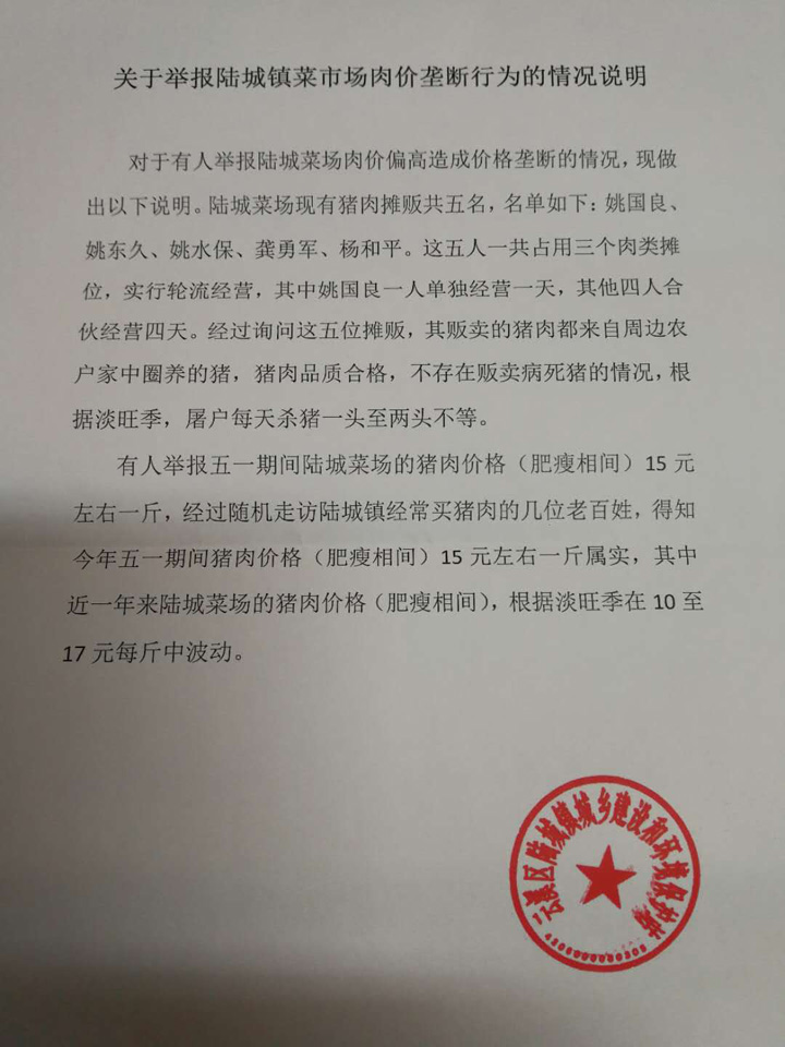 领导好: 五一返回陆城镇亲戚家游玩,得知陆城镇的猪肉(肥瘦相间)价格15元左右一斤(陆城菜市场),同品质的肉价在隔壁的长练和道仁矶均为10元左右。初步了解如下:前年菜市场的肉价为几个猪肉摊贩分别出售形成竞争,价格随市场行情涨跌,后期摊贩们形成同盟,每天只让一个摊贩进行售卖猪肉,造成价格垄断(可现地走访调查)。