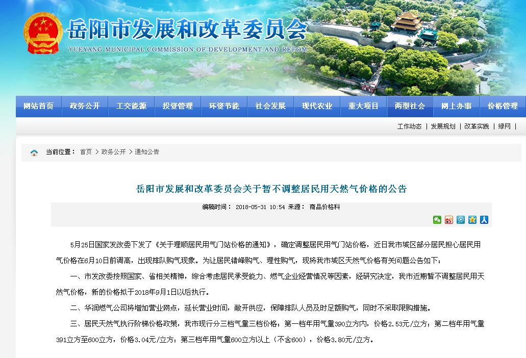 近日国家发改委发布了关于理顺居民用气门站价格的通知,该执行文件调整的居民门站价格并不是居民购买的燃气价格,岳阳市发改委今天也公布了暂不调价的通知。后续如果有调价通知,在得到准确通知后,岳阳华润燃气有限公司会根据政府物价文件第一时间对外公布调价流程和结果。