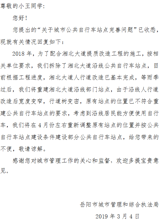 希望在湖南理工学院南院大门再新设置一个城市公共自行车站点。湖南理工学院附近现在只有“湖南理工学院行政楼”一个站点,但是因为学校人口密集,又靠近奇家岭街道,使用人员多,导致该站点经常无车可用,或者还车人太多而无法就近停车。(湖南理工学院南院大门原来有一个公共自行车站点,但因学院路提质改造而拆除了,现湘北大道已经完工,希望能恢复原有站点)