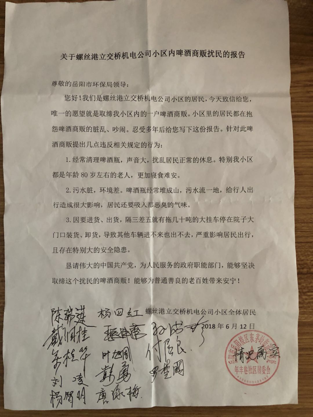 您好!我们是螺丝港立交桥机电公司小区的居民,今天致信给您,唯一的愿望就是取缔我小区内的一户啤酒商贩。小区里的居民都在抱怨啤酒商贩的脏乱、吵闹。忍受多年后给您写下这份报告。针对此啤酒商贩提出几点违反相关规定的行为:
