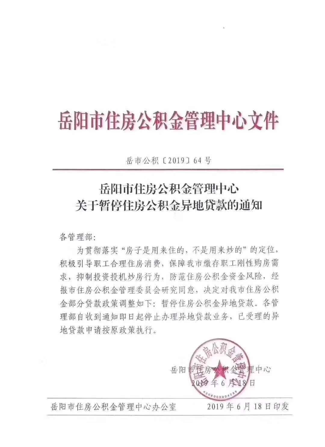 就您对住房公积金政策的相关建议现予回复:根据《岳阳市住房公积金管理委员会关于调整部分贷款政策的通知》(岳住委【2019】7号)文件规定:经市住房公积金管理委员会研究同意,决定对我市住房公积金部分贷款政策调整如下:暂停我市住房公积金异地贷款。此文件于2019年6月18日执行。