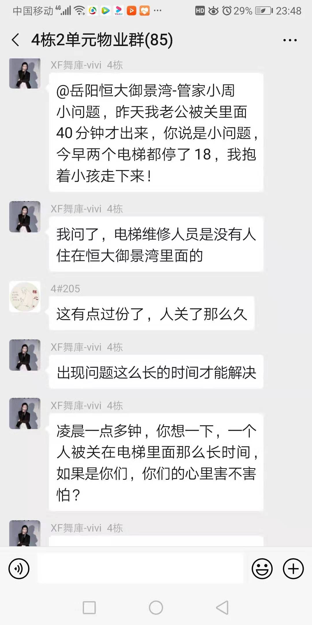 您好!您咨询关于恒大御景湾4栋电梯险闹人命,物业人员致业主安危不顾脱离岗位的问题已收悉,现经市物业服务中心核实处理后,回复如下:
