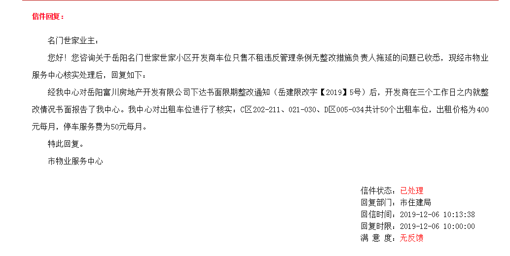 11底继续投诉开发商故意拖延出租车位,后得到相关部门回复“经我中心对岳阳富川房地产开发有限公司下达书面限期整改通知(岳建限改字【2019】5号)后,开发商在三个工作日之内就整改情况书面报告了我中心。我中心对出租车位进行了核实:C区202-211、021-030、D区005-034共计50个出租车位,出租价格为400元每月,停车服务费为50元每月。”