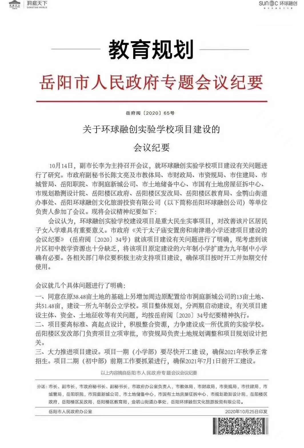 房产销售人员声称市领导会议决定,在融创环球中心配备九年制学校(并展示有会议纪要)。也就是说融创环球中心除了配备有小学,还配备有初中。这是真实可靠的信息。