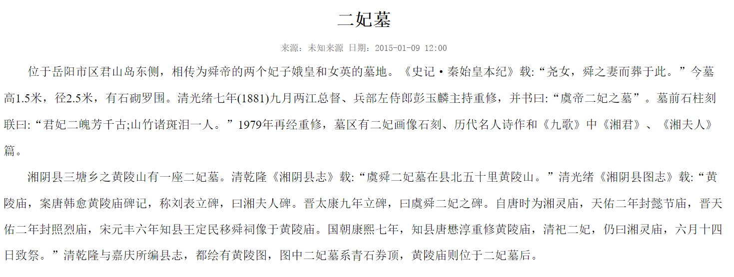 位于岳阳市区君山岛东侧,相传为舜帝的两个妃子娥皇和女英的墓地。《史记·秦始皇本纪》载:“尧女,舜之妻而葬于此。”今墓高15米,径2.5米,有石砌罗围。清光绪七年(1881)九月两江总督、兵部左侍郎彭玉麟主持重修,并书日:“虞帝二妃之墓”。墓前石柱刻联曰:“君妃二魄芳千古;山竹诸斑泪一人。”1979年再经重修,墓区有二妃画像石刻、历代名人诗作和《九歌》中《湘君》、《湘夫人》篇