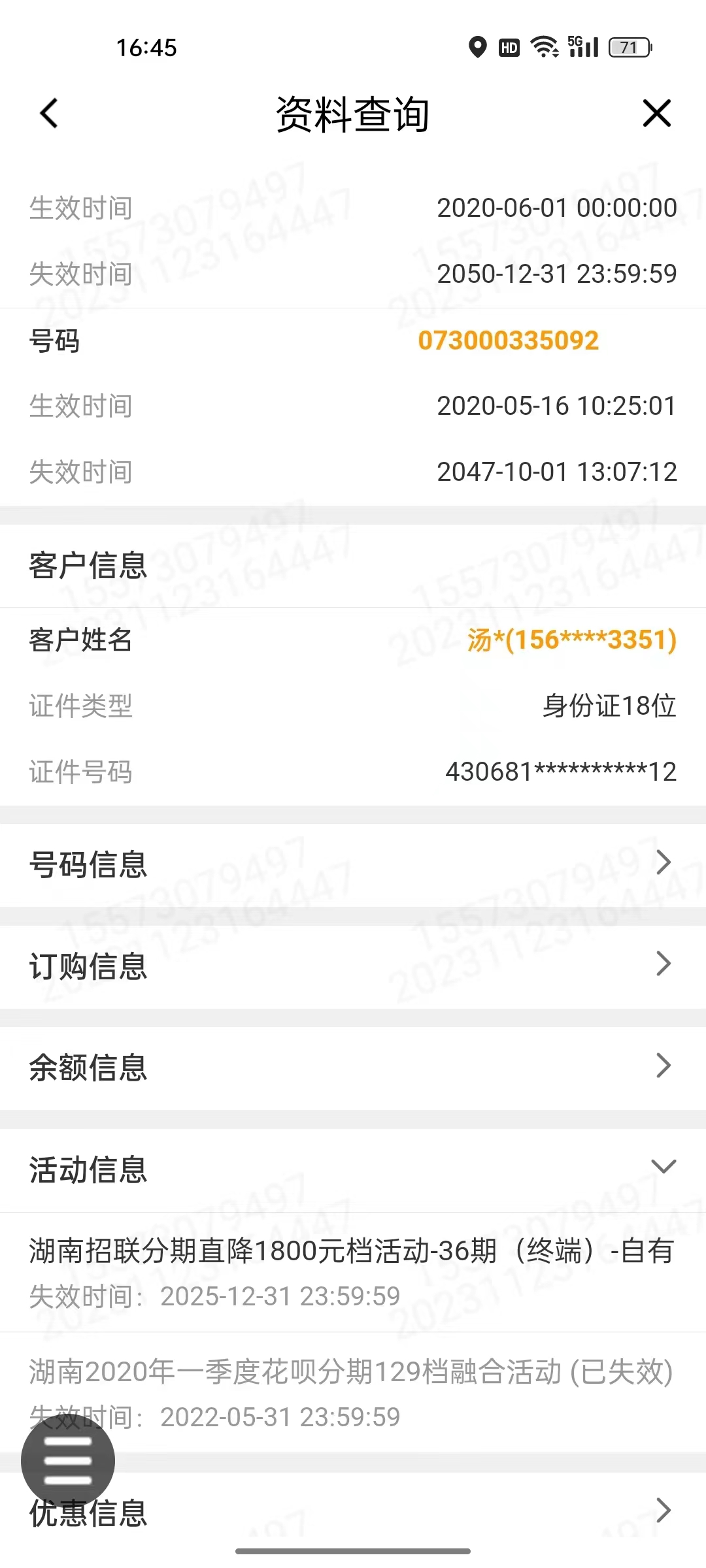 自从2023年11月23日, 我户通过相关渠道对在中国联通公司办理的电话卡进行查询后,发现在卡套餐活动信息中发现中国联通在未经过用户的允许下,后台系统造假,私自帮我开通了三年-湖南招联分期直降1800元档活动-36期的活动。发现相关问题后,我户于2023年11月23日拨打10010进行人工客服投诉,反馈相关问题。