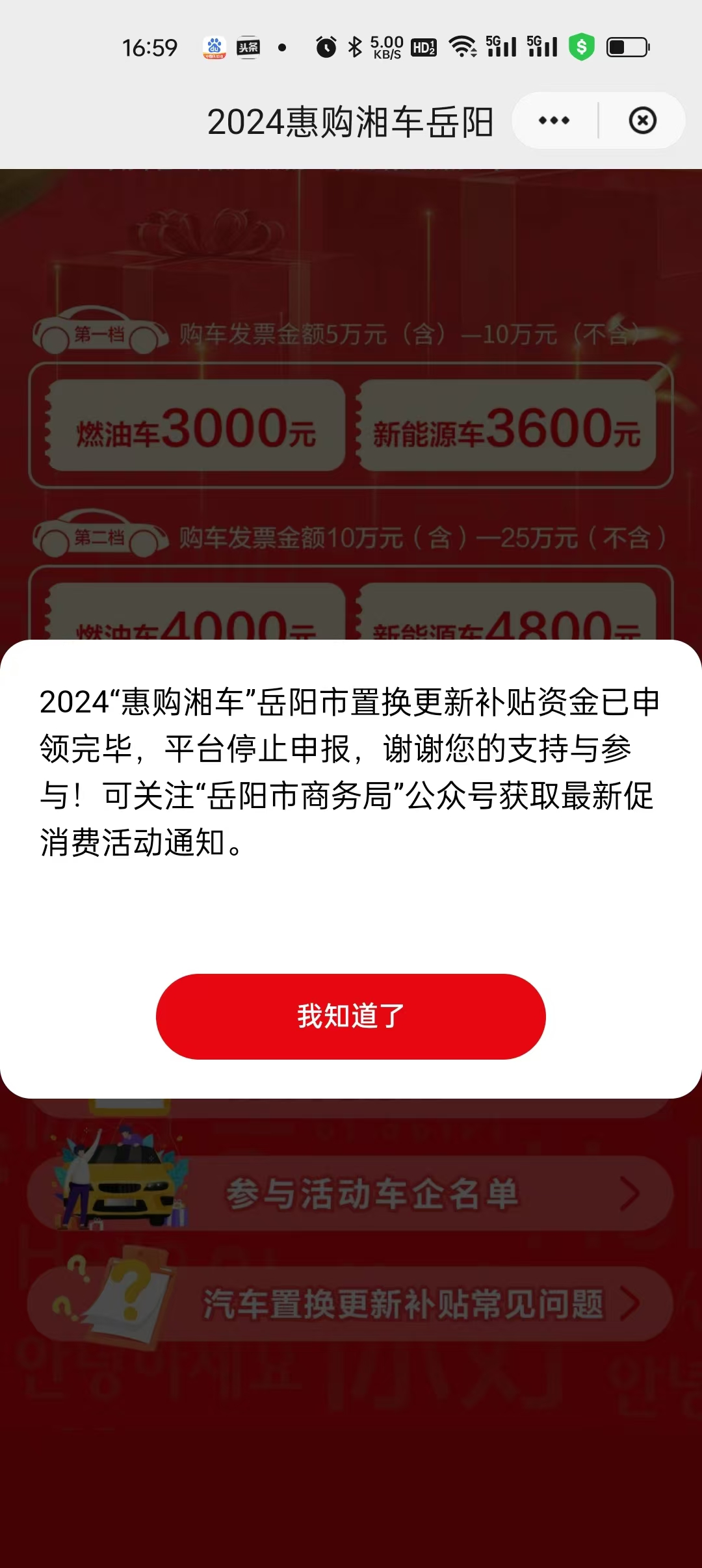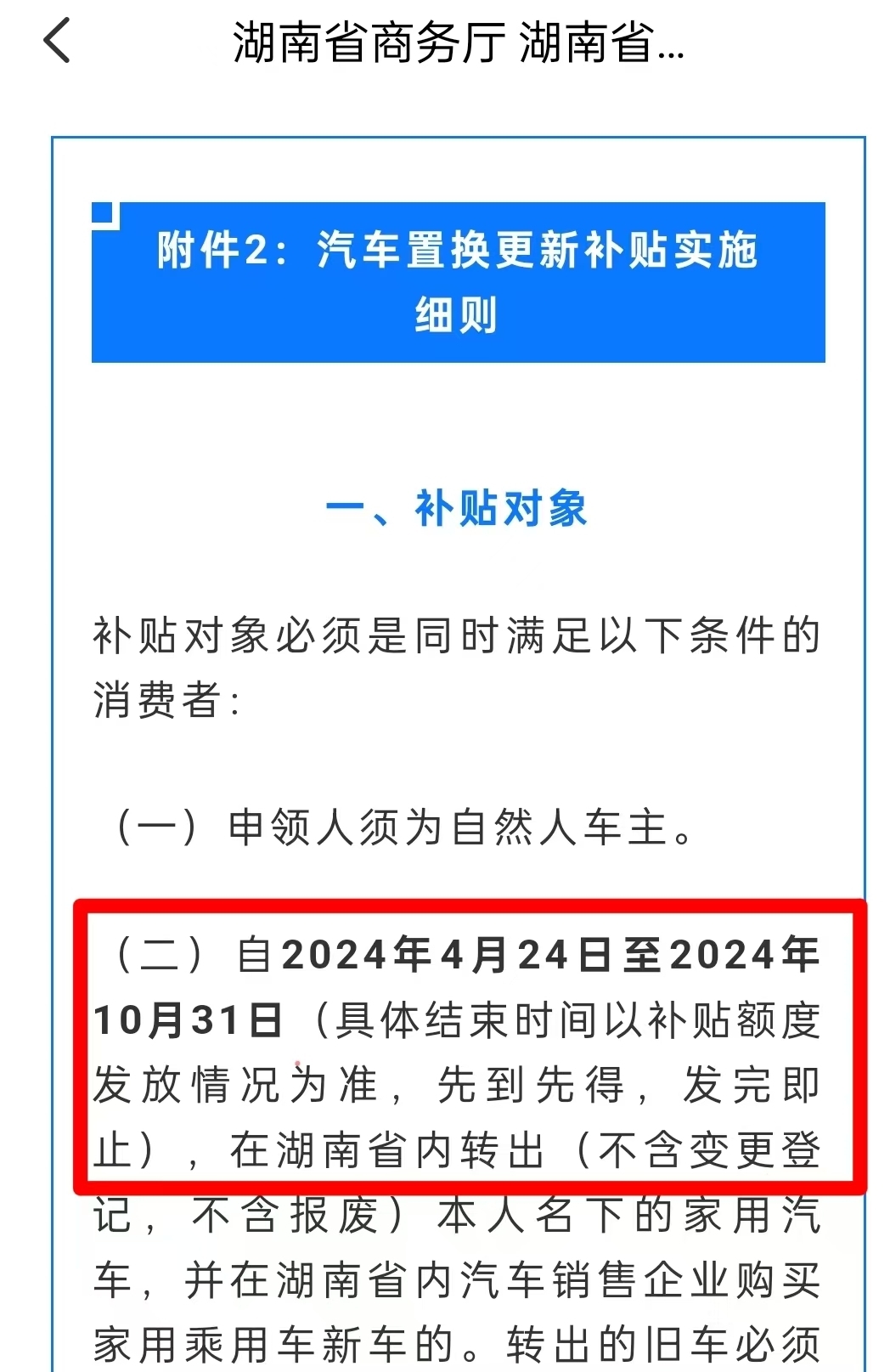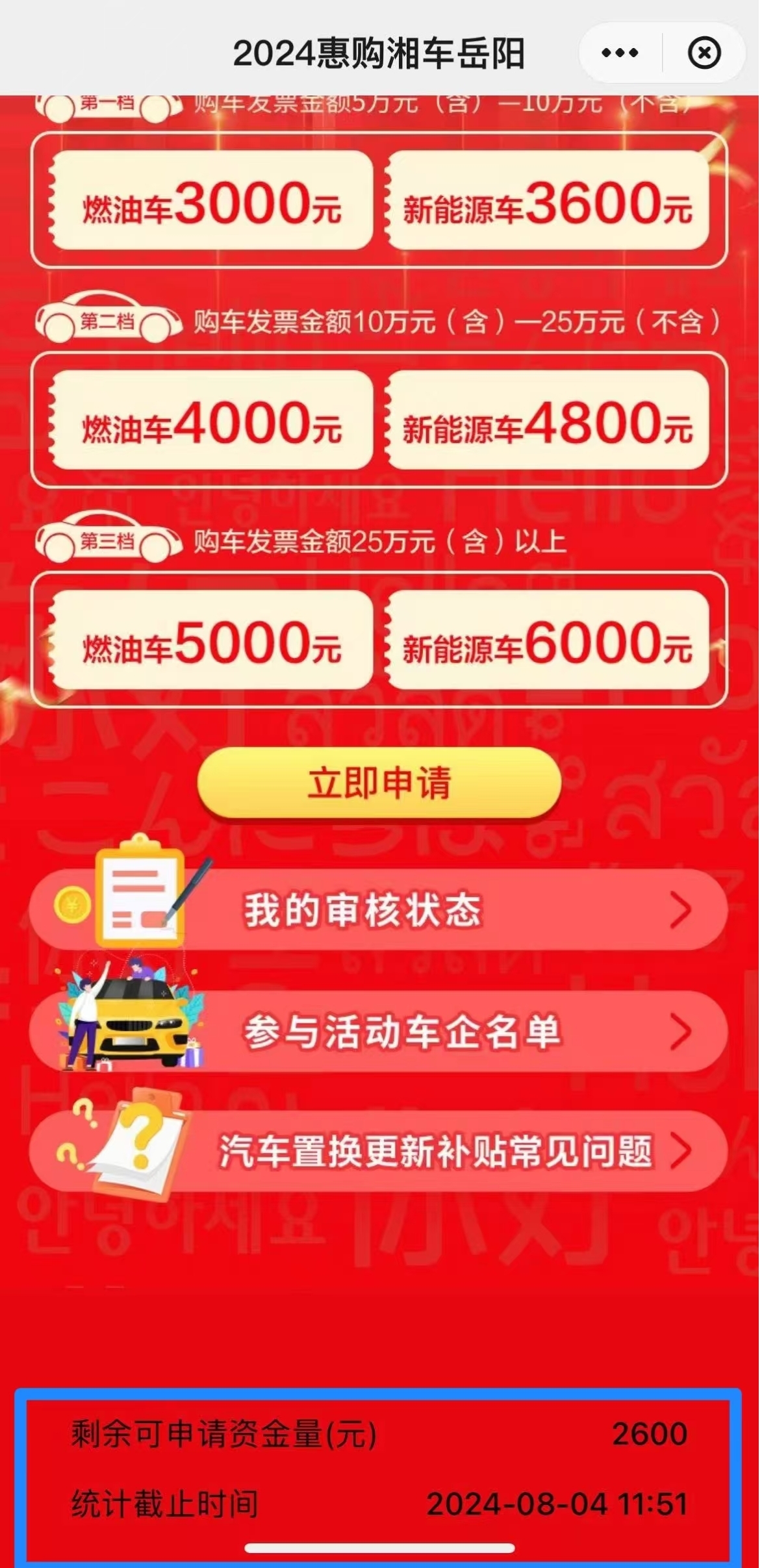 为贯彻落实《国务院关于印发<推动大规模设备更新和消费品以旧换新行动方案>的通知》(国发〔2024〕7号)、《商务部等14部门关于印发<推动消费品以旧换新行动方案>的通知》(商消费发〔2024〕58号)、《商务部、财政部等7部门关于印发<汽车以旧换新补贴实施细则>的通知》(商消费函〔2024〕75号)和《湖南省推动大规模设备更新和消费品以旧换新实施方案》(湘政发〔2024〕5号)精神,湖南省商务厅、湖南省财政厅决定联合各市州开展2024“惠购湘车”以旧换新促销活动。在《汽车置换更新补贴实施细则》中明确活动时间为“2024年4月24日至2024年10月31日(具体结束时间以补贴额度发放情况为准,先到先得,发完即止)”,补贴标准为3000元-6000元不等;并且在云闪付申请置换补贴页面有“剩余可申请资金量”显示,而截止2024年8月4日11:51,我市补贴额度剩余2600元,不足以发放补贴,即活动即时停止。(见图1-3)