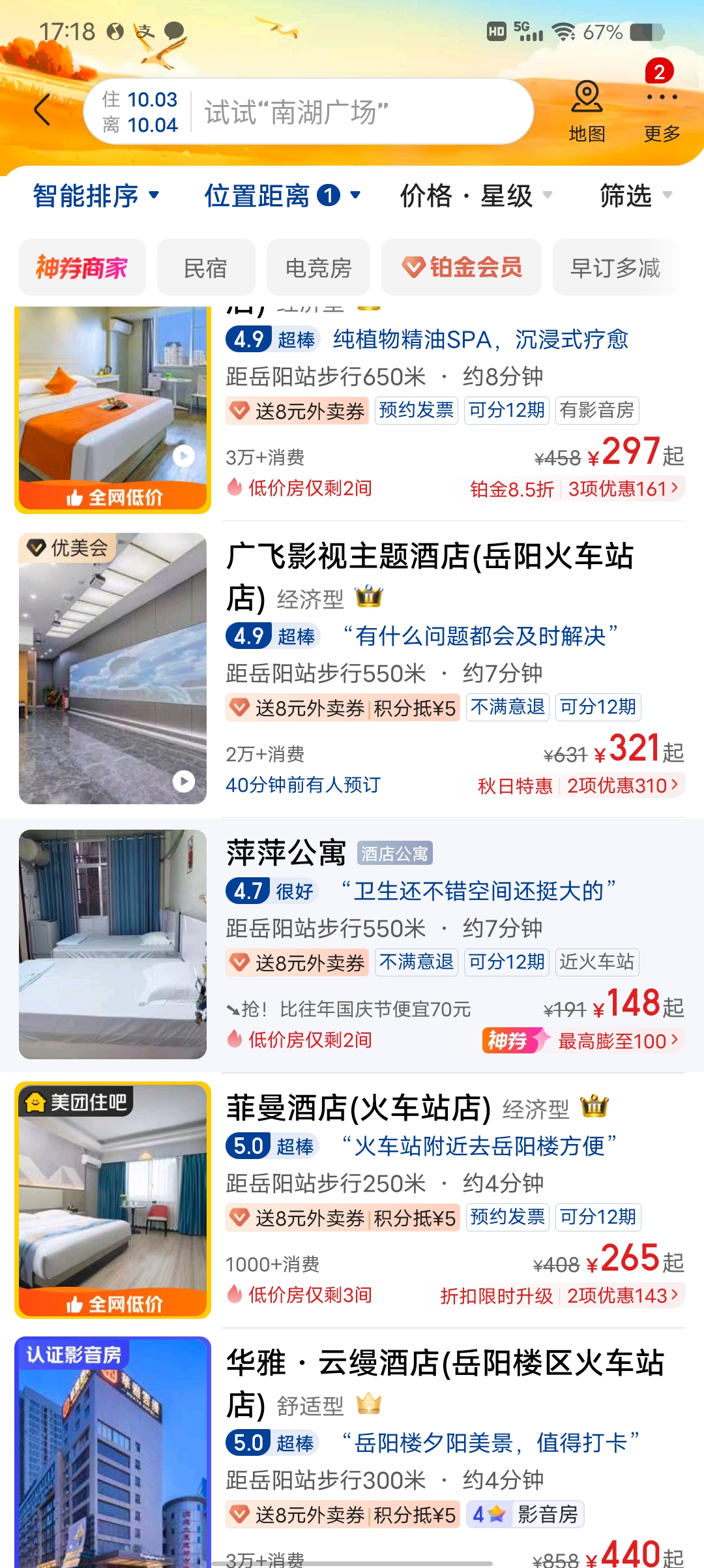 国庆准备来岳阳旅游,以前在岳阳上学,岳阳什么物价心里都知道 物美价廉,可是这次打开美团准备定国庆节酒店,发现酒店价格飙升 以前100多的要300,几十的小宾馆,现在150往上,要带动岳阳经济旅游发展 但是酒店住宿问题太严重了,我也看了株洲其他地方 都还是有平价的酒店 但是岳阳职院那些经济型环境差的酒店还是钥匙开门的都要100+,一些小宾馆都要100+,我以前住的广飞影视酒店115投影房,现在国庆300+。价格升的太离谱。