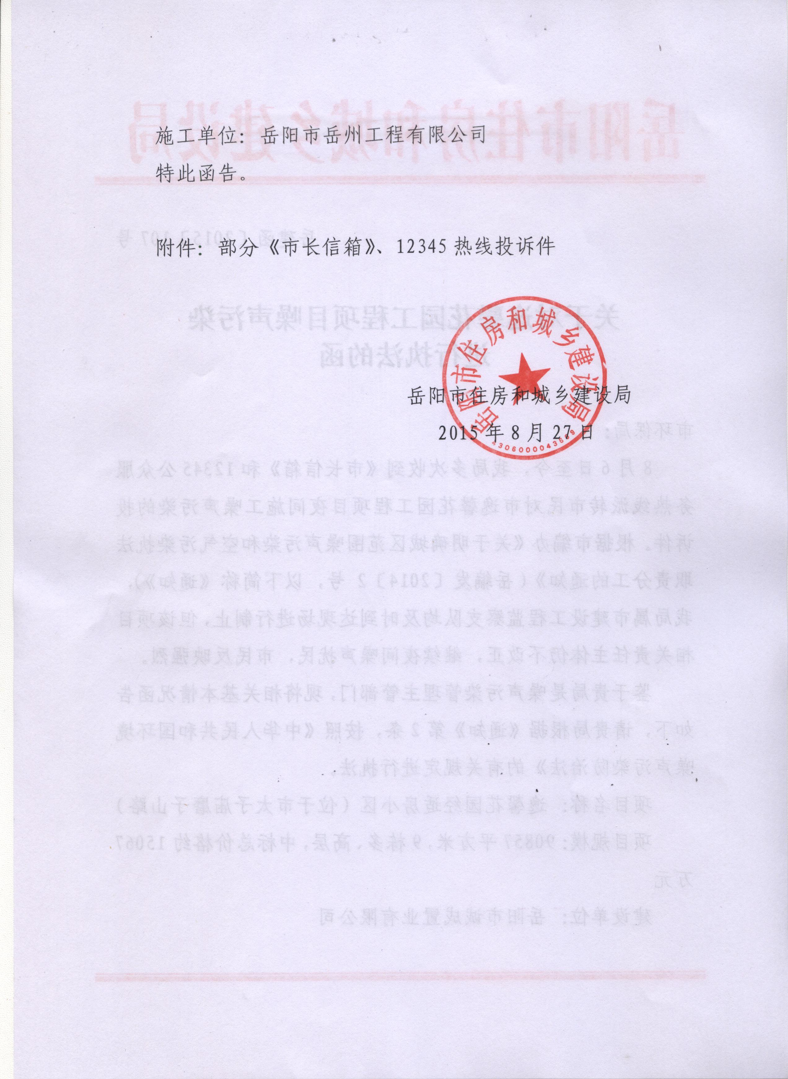您好!关于逸馨花园项目噪声扰民的问题,我局根据市编办《关于明确城区范围噪声污染和空气污染执法职责分工的通知》(岳编办发[2014]2号)文件要求,向市环保局送达《关于对逸馨花园工程项目噪声污染进行执法的函》(岳建函[2015]107号),具体内容详见附件(扫描件)。