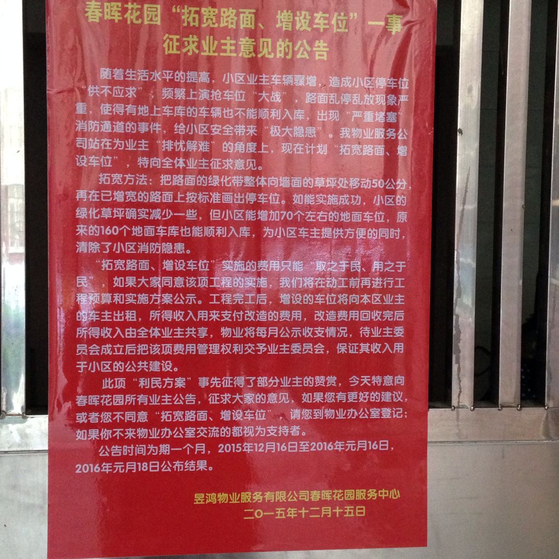12月15日,在春晖花园小区看到物业贴出一个公告,说要将本来不多的绿化改为停车场,并出租,我作为春晖花园的业主,坚决不同意,严正抗议并反对,本来就容积率超标,绿化很少,还借着由头,美其名为业主改善小区环境,坚决反对,希望市长为民做主,人民相关部门,为我们老百姓做主,我再次坚决反对将绿化改为停车场,地面已经建了违规的停车场,还想增加。作为业主我强烈表示反对物业做法。同时也请相关部门领导重视我们业主的声音,为老百姓出声,谢谢。
