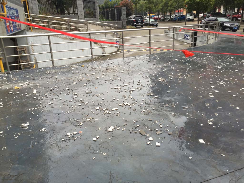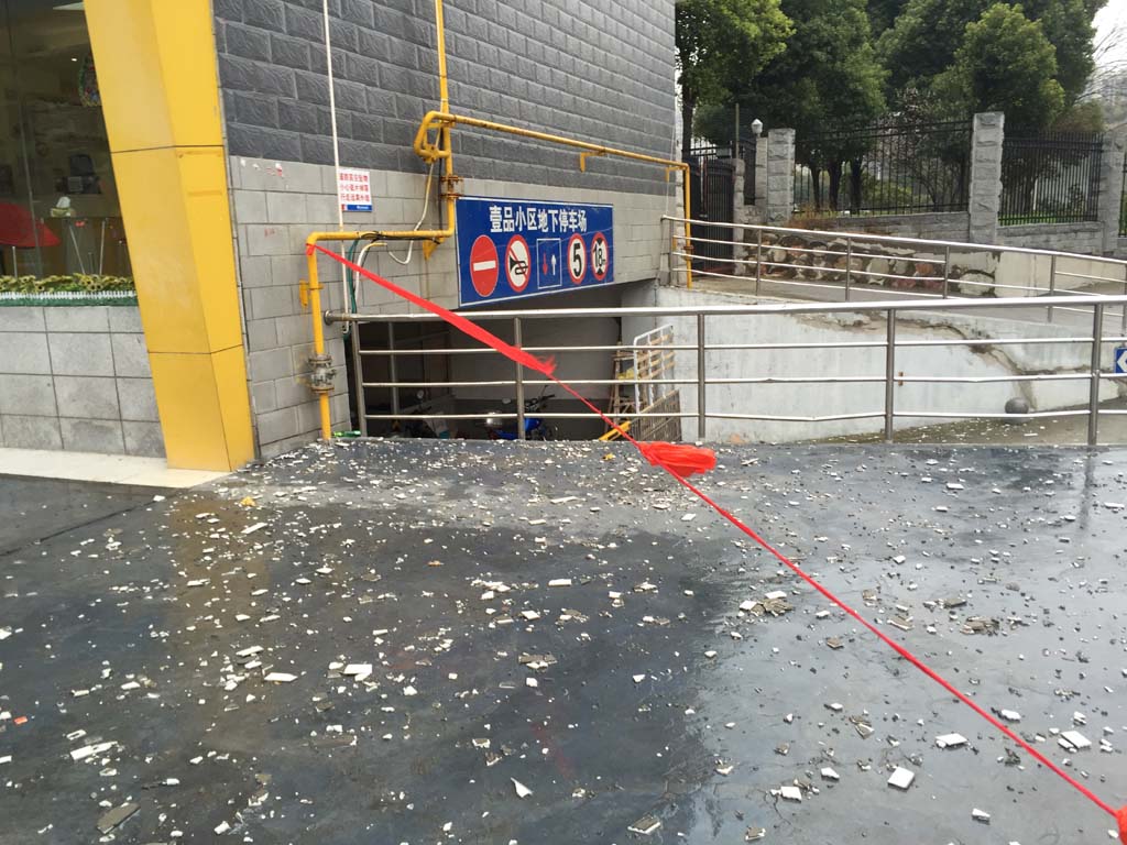 岳阳市健康路远鹏壹品小区自2010年下半年交房开始,由于外墙瓷砖质量不合格,住户发现房子外墙瓷砖出现了鼓胀并掉落现象, 走出家门就担心天上掉东西砸到自己,陆续有住户向相关责任单位反映过,瓷砖掉落后,小区业主多次向物管反映此事,但物管却只是哪儿出问题补哪里,哪里瓷砖空鼓请人敲哪里,一直拖着不彻底解决,并称是开发商的问题。如今,物管又以房子过了5年保修期为由,让业主自行处理。近5年陆续有车辆被掉落的瓷砖砸坏,所幸无行人被砸伤。2016年3月8日上午,外墙一处大面积鼓胀瓷砖脱落砸到下方人行道和车库出口上,幸运的是并没有造成人员伤亡。可瓷砖砸落之后,除了将附近可能掉落瓷砖的人行道用警戒线围起来之外,依旧无相关部门来处理这个安全隐患。