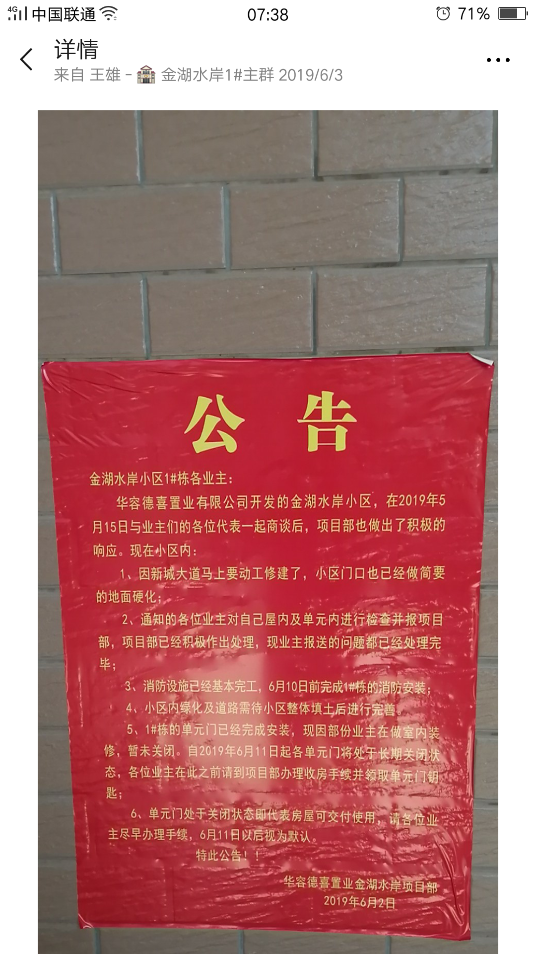 华容县金湖水岸小区延迟交房6个月 小区内的基本绿化,路面硬化都没完成,小区内积水都还相当严重,无任何补偿不说,开发商自行发公告强行收房,6.10之前不办理收房手续默认交房,政府的任何验收证书都没有。上访致华容相关部门,各部门互相推诿,业主投诉无门,一辈子的积蓄买的房子,现在变成这个样子,希望能有人帮帮我们。